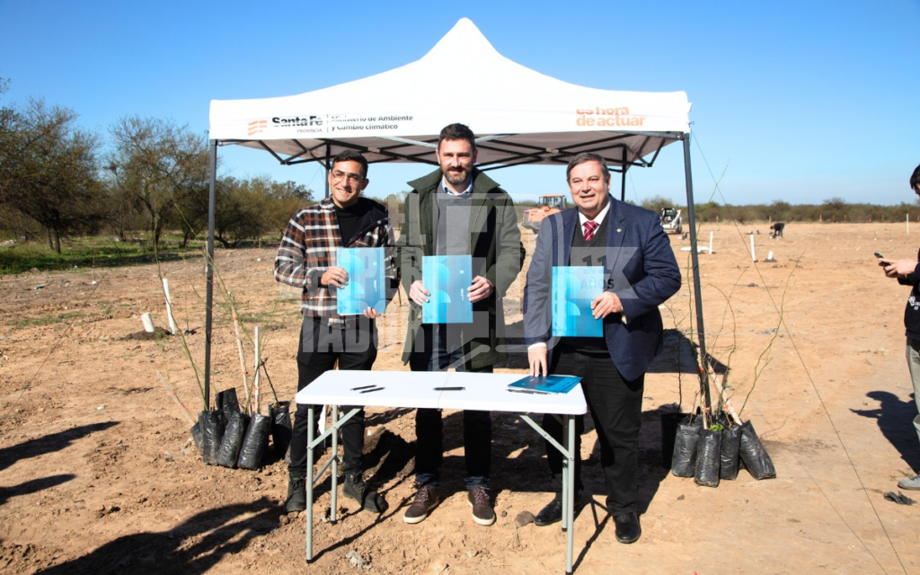 La firma fue realizada por el Rector de la UNL Enrique Mammarella, el Ministro de Ambiente y Cambio Climático Enrique Estevez y el Intendente de la ciudad de San José del Rincón Eduardo Soperez, y en la oportunidad también se realizó la entrega de ejemplares por parte de la universidad y del ministerio provincial.