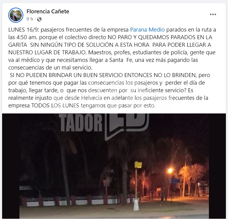 Florencia Cañete, docente de historia en Helvecia y usuaria frecuente del servicio de transporte de la empresa Paraná Medio, utilizó las redes sociales para visibilizar la problemática que afecta a los pasajeros que viajan utilizando ese servicio. Cada lunes, los usuarios enfrentan la falta de espacio en el colectivo de las 5:00 a.m., quedando varados en la ruta 1 sin una solución inmediata.