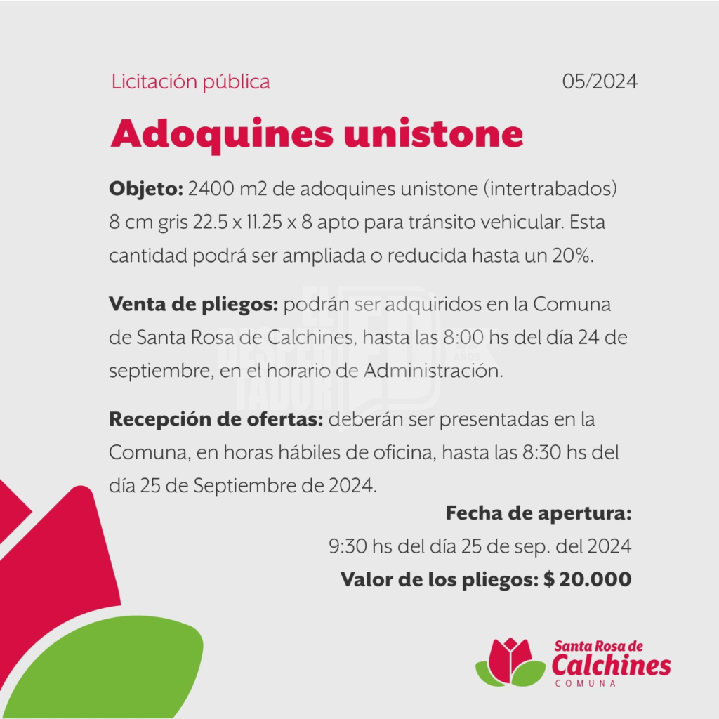 La Comuna de Santa Rosa de Calchines anunció la apertura de la licitación pública 05/2024 para la adquisición de adoquines que serán utilizados en diversas calles de la localidad. Las empresas interesadas podrán presentar sus ofertas hasta el 25 de septiembre, con el objetivo de mejorar la infraestructura vial en los barrios más transitados.