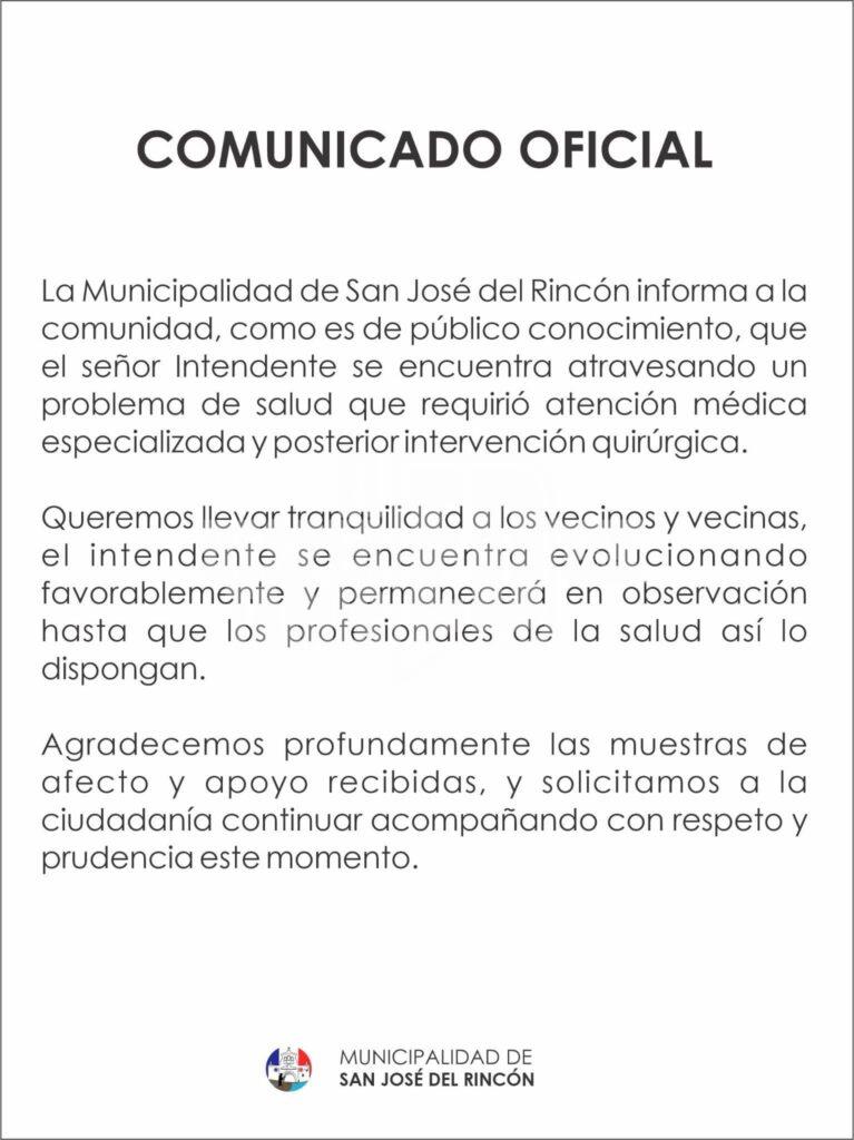 La Municipalidad de San José del Rincón emitió un comunicado oficial para informar a la comunidad sobre el estado de salud del intendente, quien debió ser sometido a una intervención quirúrgica luego de atravesar un problema médico que requirió atención especializada.