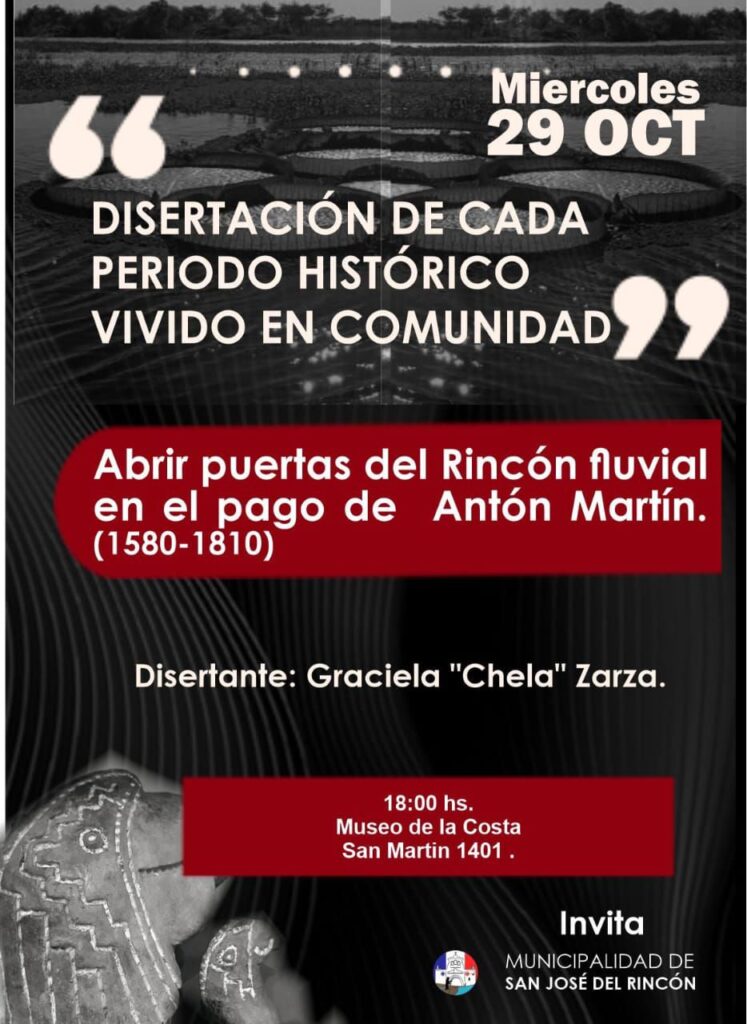 Este miércoles 29 de octubre a las 18 horas, la profesora Graciela “Chela” Zarza brindará una charla titulada “Abrir puertas del Rincón fluvial en el pago de Antón Martín (1580-1810)” en el Museo de la Costa de San José del Rincón.