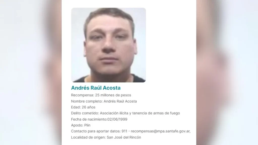 El gobierno de la provincia de Santa Fe incorporó a Andrés “Plin” Acosta al listado de los prófugos más buscados y anunció una recompensa de 25 millones de pesos para quienes aporten información que permita dar con su paradero.