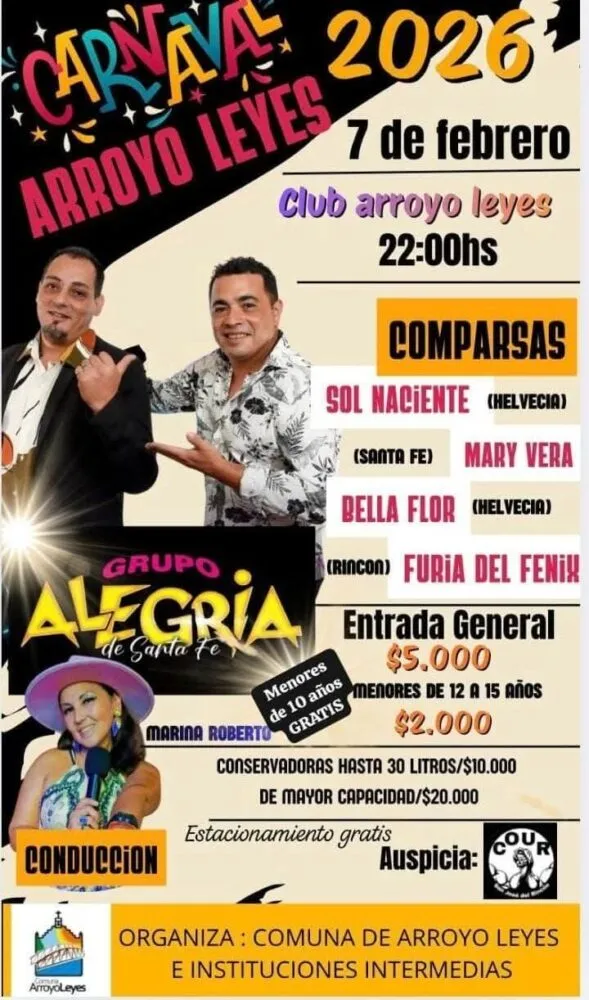 Los carnavales se realizarán el sábado 7 de febrero de 2026, desde las 22, en el Club Atlético Arroyo Leyes. El valor de la entrada general será de $5.000; para menores de 12 a 15 años, $2.000; mientras que los menores de 10 años ingresarán sin cargo. El estacionamiento será gratuito.
