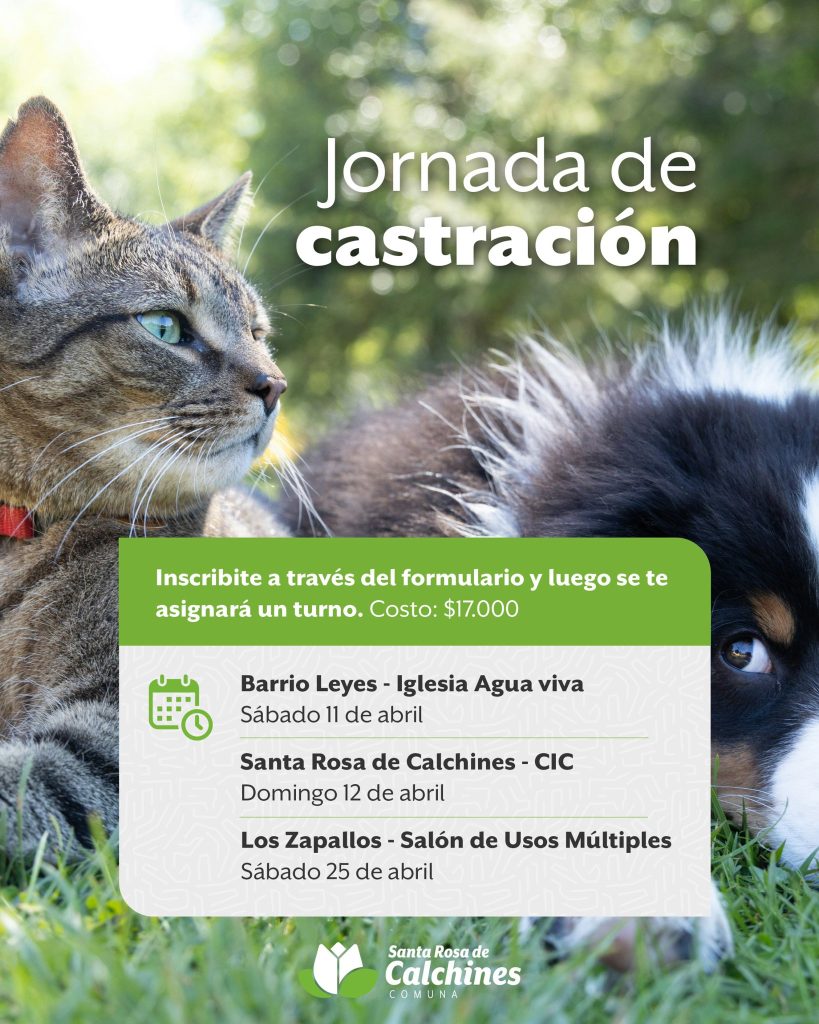La comuna de Santa Rosa de Calchines anunció la apertura de inscripciones para una nueva serie de jornadas de castración de mascotas. La atención será únicamente con turno previo, que se asignará tras completar un formulario online.